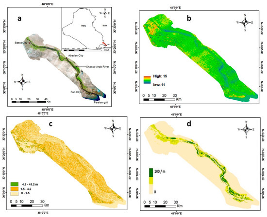 (a) Landsat imagery for the Shatt Al-Arab River study region in Iraq (From: USGS: https://earthexplorer.usgs.gov/ accessed on 13 May 2021); (b) SRTM 1 arc second (30 m) global coverage (From: NASA Shuttle Radar Topography Mission (SRTM) Version 3.0 Global 1 arc second); (c) SRTM-derived slope (From: USGS: https://pubs.usgs.gov/pdf/ accessed on 13 May 2021); (d) vegetation cover fraction (VCF) (derived from Landsat 5 TM Collection 1).
