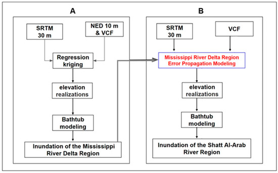 Transferring the error propagation model from the Mississippi River Delta region (A) to the Shatt Al-Arab River region (B).
