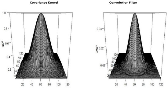 where h is the correlation coefficient and r is the specified range of the DEM error. The convolution filter method worked as follows. We simulated standardized Gaussian noise for pixels throughout a raster. We then calculated a moving window filter using the convolution algorithm proposed by Oksanen and Sarjakoski [33] to reproduce the desired Gaussian covariance function; an example is shown in Figure 3.