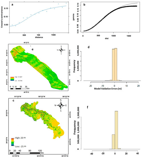Error assessment for variogram model: (a) MRDR error model residual variogram and model (line); (b) SARR variogram model (line) and variogram of simulation output (circles); (c) MRDR map of model-predicted SRTM elevation errors; (d) MRDR histogram of predicted SRTM errors; (e) SARR map of model-predicted SRTM elevation errors; (f) SARR histogram of predicted SRTM errors.