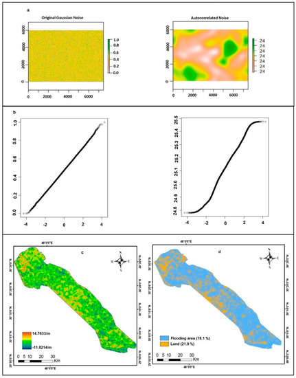 SRTM realizations: (a) random Gaussian noise for the SARR and spatially autocorrelated noise following convolution filtering; (b) QQ plots of random and convolution-filtered Gaussian noise; (c) DEM realization number 10; (d) bathtub modelling SRTM realization number 10.