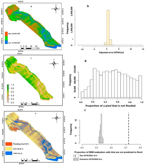 Consistent to the literature and according to the 1 m scenario in this study, the spatial extent of inundation for a 1 m sea level rise in the SARR was calculated using the original SRTM DEM and is mapped in Figure 6c. Compound model results, developed by running the inundation model on all fifty realizations, are mapped in Figure 6e. In this comparison, each map shows three classes: water, where areas are at or below 0 m of elevation; land, where areas are above 1 m; and flooded, where areas are between 0 and 1 m due to being inundated by this amount of flooding. While only 28% of the land surface was indicated as flooded using the raw SRTM, the DEM realizations showed a substantial difference with nearly 50% of the land area being flooded across all realizations. Figure 6d,f depict histograms of the proportion of land area that remained dry for these realizations. Figure 6f also shows the raw SRTM data depicted by the vertical dotted line positioned well to the right of any bars in the histogram.