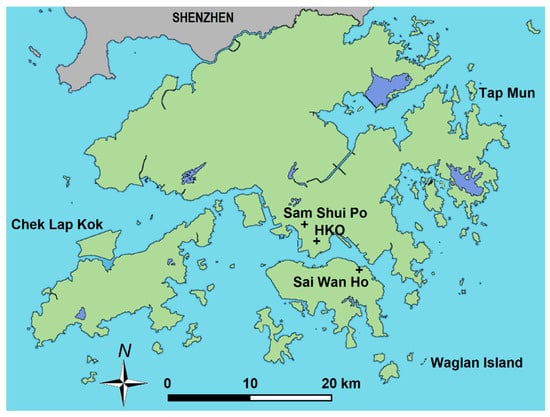 Long-term records of visibility in Hong Kong are available from the Hong Kong Observatory (HKO). The lengthier records from 1968 present the number of hours of reduced visibility observed at the HKO. Reduced visibility means that the visual range falls below 8 km, with relative humidity <95% and no fog, mist, or precipitation. The values at the Observatory on the Kowloon Peninsular are based on hourly observations made by trained meteorological observers. There are further observations derived from automatic visibility readings made at Chek Lap Kok, Central, Sai Wan Ho, and Waglan Island (see map Figure 1), representing a 10-minute interval ending at the indicated time. The long-term record as monthly values is available at: https://www.hko.gov.hk/en/cis/statistic/hko_redvis_statistic.htm (accessed 3 June 2021), along with the records at Hong Kong International Airport since 1997 at: https://www.hko.gov.hk/en/cis/statistic/hka_redvis_statistic.htm (accessed 3 June 2021).