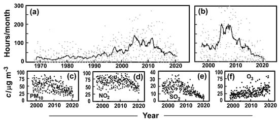 The classic picture of visibility in Hong Kong is shown in the graphical abstract. This is frequently seen in popular presentations and academic publications and is a feature of the HKO website. It conveys a sense of change occurring over more than fifty years. In the past, this record has been used to convey the worsening visibility in the city up to the first decade of the 21st and in parallel, represent the trend in long-term particulate levels given the lack of long-term measurements. The visibility record shown in Figure 2a gives the hours of low visibility (nLV) each month as a function of time, with a line representing the smoothed annual running mean. The visibility at the airport is shown in Figure 2b, and although it initially has more hours of low visibility, it improves rapidly and continuously from peaks early in the 21st century, showing a rather similar change over time to that at the HKO, suggesting that these changes were widely experienced across the territory. The figure indicates the situation of worsening visibility that created so much concern 10–20 years ago. However, from about 2005, the number of hours of low visibility gradually decreased and loosely aligned with improvements in PM, NO2, SO2, though not O3 (Figure 2c–f). The years 2004–2006 contained seven of the worst months in the Hong Kong record. The other five worst months were in February, March, July, August and November, between 2010 and 2012.
