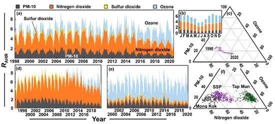 (a) Added contributions to the health risk (RAHR) from PM10, NO2, SO2, and O3 at Sam Shui Po, (colloquially SSP). (b) Monthly averages of health risk for the pollutants for the years 2015–2019. (c) Ternary diagram showing average annual health risk from PM10, NO2, and O3 at Sam Shui Po from 1998–2020. (d) Added contributions to the health risk from PM10, NO2, SO2, and O3 at the Mong Kok roadside site. (e) Added contributions to the health risk from PM10, NO2, SO2, and O3 at the rural site on Tap Mun (Grass Island). (f) Ternary diagram showing average monthly health risk from PM10, NO2, and O3 at Sam Shui Po (1998-02/2020-09), Mong Kok (2011-01/2020-09), and Tap Mun (1998-01/2020-04). Note: (i) scale change between Figure 3a,d,e (ii) color/shades and order for the pollutants plotted remain the same for Figure 3a,b,d,e.