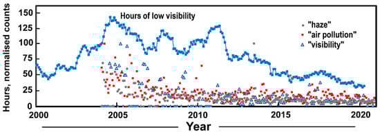 A trend in public opinion about air quality in Hong Kong can be seen from Google Trends, which provides the frequency of search queries in Google over time (Figure 4). The record goes back to 2004 and is displayed for the search terms (i) “visibility”, (ii) “air pollution”, and (iii) “haze”. Search frequencies roughly parallel the smoothed decline in hours of low visibility. Search frequency appears noisy because sometimes the number of searches is low, so there are frequent zero values. Caution is needed when interpreting these changes. Although they show a declining interest in searching, this does not necessarily reflect a decline in concern, as it could be that public knowledge has reached a point where searches are no longer frequent.