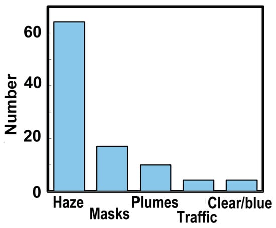 Perceptions of the relationship between visibility and air pollution may also be sensed in images chosen by the media. Hong Kong’s English language newspaper, the South China Morning Post published 70 articles on air pollution from December 2018 to December 2020 to hint at current perceptions. Forty of these contained images showing visibility degraded by haze, suggesting that haze remains an important icon for air pollution. Haze was more frequently associated with air pollution than other images, such as traffic or factories chimneys with plumes of smoke. Figure 5 shows the key representations in the pictures featured in articles, e.g., haze surgical mask, plumes from a chimney, blue or clear sky notions from images associated with these articles.