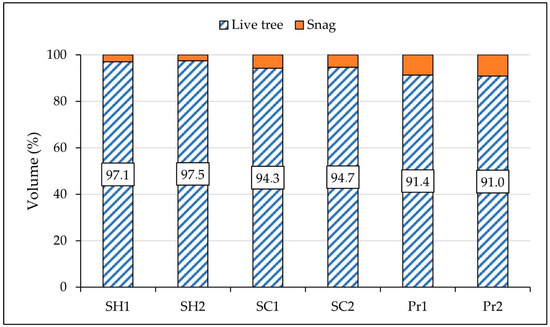 Results showed that the proportions of snag volume in the Pr stands were 8.6% and 9% from total standing volume, while the proportions in the Sc stands were 5.3% and 5.7%, and in the Sh stands they were 2.5% and 2.9% (Figure 1).