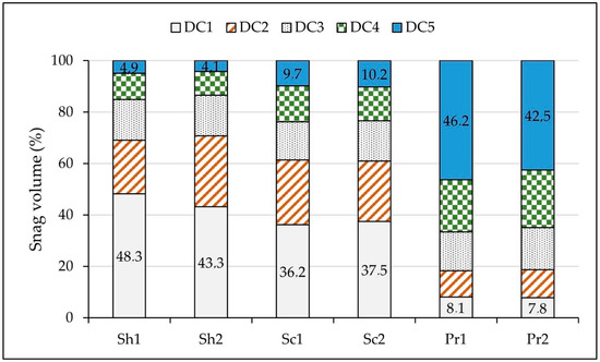 Results indicated that DC1 had the highest volume proportion of snags in the Sh and Sc stands, while DC5 had the highest volume proportion of snags in the Pr stands (Figure 2). The volume proportion of snags decreased by increasing their decay intensity in the Sh and Sc stands, while the volume proportion of snags increased by increasing their decay intensity in the Pr stands.