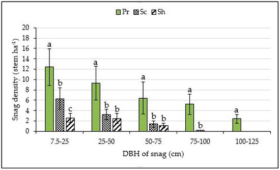 Snag density decreased by increasing their dbh class in the studied stands (Figure 3). Snag density in the Pr stands was significantly higher than in the Sc and Sh stands in all of the dbh classes. Snag density in the Sc stands was higher than in Sh stands in all pf the dbh classes, but the difference was significant only in the 7.5–25 cm class. Snags with a dbh > 75 cm were not observed in the Sh stands, and snags with a dbh > 100 cm were not observed in the Sc stand, while snags with a dbh of 100–125 cm had a density of 2.4 stem ha−1 in the Pr stands.