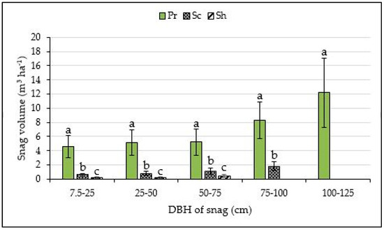 Results showed that snag volume increased by increasing their dbh class (Figure 4). Snag volume in the Pr stands was significantly higher than their volume in the Sc and Sh stands. The mean volume of snags with a dbh > 100 cm in the Pr stands was 12.2 m3 ha−1.