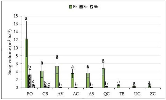 Results showed that the snag volume consisted of more species in the Pr stands than in the Sc and Sh stands (Figure 5). The snags of F. orientalis had the highest values among species in all studied stands. The volume of all snag species in the Pr stands was significantly higher than the Sc stands, and in the Sc stands the volume was significantly higher than the Sh stands.