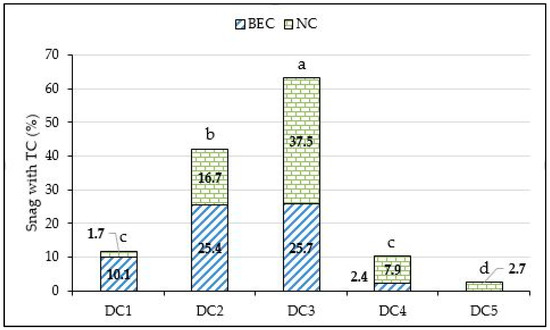 Results showed that the highest frequency of snags with TC was in DC3 followed by DC2 > DC1 > DC4 > DC5 (Figure 6). More than 60% of DC3 snags and about 42% of DC2 snags had TC, while 11.8% of DC1 snags and 10.3% of DC4 snags had TC, and only 2.7% of DC5 snags had TC. The results showed that in the snags with less decay intensity (DC1 and DC2) the frequency of BEC was higher than the frequency of NC, while in the snags with more decay intensity (DC3 and DC4), the frequency of NC was higher than the frequency of BEC, so that in very decayed snags (DC5) BEC was not found.