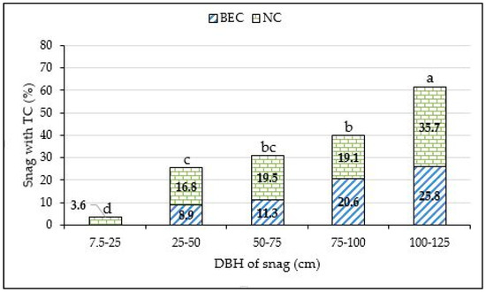 Results indicated that the frequency of snags with TC increased with the increasing dbh of snags (Figure 7). About 61% of snags with a dbh class of 100–125 cm had TC, while only 3.6% of snags with a dbh of 7.5–25% had TC. The results showed that the frequency of BEC increased with increasing snag diameter. BEC were not observed in snags with dbh < 25 cm.