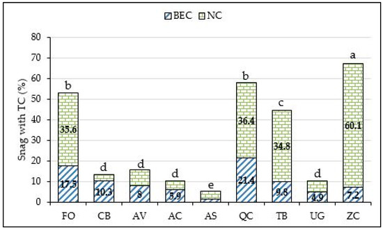 Frequency of snags with tree cavity (TC) in different snag species (χ2 = 113.9, p < 0.01). (FO: F. orientalis; CB: C. betulus; AV: A. velutinum; AC: A. cappaducicum; AS: A. subcordata; QC: Q. castaneifolia; TB: T. begonifolia; UG: U. galbra; ZC: Z. carpinifolia). BEC: bird excavated cavity; NC: natural cavity. Different letters among columns indicate statistically significant differences according to both Duncan’s test and the Chi-square test (TC ratio in pairs).