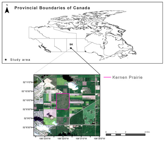 Location of Kernen Prairie within the provincial boundaries of Saskatchewan (SK), Canada (upper figure), and on a Sentinel-2 image of 11 July 2020 (lower figure). Source of Canadian Provincial Boundaries: Statistics Canada (Open-Government License—Canada) [41], source of Sentinel-2 image: ESA (‘Copernicus Service information 2020’ for Copernicus Service Information) [42], source of Kernen Prairie boundary layer: Department of Plant Science, University of Saskatchewan (Dr. Eric Lamb).