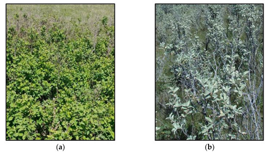 Wolfwillow (Elaeagnus commutata) or silverberry belongs to the Elaeagnaceae family and, native to south Canada, it is a deciduous rhizomatous perennial shrub (1–4 m tall) [55]. It forms thickets or loose colonies, and one of the ecosystems in which it occurs is the plains grasslands [56]. This species can be found along streams, and near springs, while it can grow on different slopes, elevations, aspects, and soil conditions [49]. It thrives in loamy soils, but is also found in dry, sandy, and gravel soils [57]. Specifically, in the mixed-grass prairie, it is frequently found together with western wheatgrass, needlegrass, and rough fescue [58]. In Saskatchewan, it is common on native fescue grasslands [59]. In particular, wolfwillow had minor cover in the 1950s, in contrast to its currently wide distribution [60]. Wolfwillow adapts well to areas that are disturbed. This is why it is increasing on rangelands that are overgrazed by cattle [58]. Wolfwillow has the ability to spread fast through rhizomes [60], but it seems to not recover fast after burning [59]. It is shade intolerant [61], justifying its common presence in open vegetation. This species is also resistant to drought, wind, and extreme cold temperatures up to −40 °C [57]. Wolfwillow might also increase the available forage for cattle by fixing nitrogen, making it available to other surrounding species and plants [49]. Hence, the complete eradication of wolfwillow should be avoided [62]. Nevertheless, it seems that areas with wolfwillow are grazed less than half as much as neighboring grass areas that do not have this species [62].
