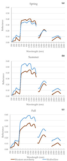 Average spectral signatures for western snowberry and wolfwillow in (a) spring, (b) summer, and (c) fall (water absorption regions between 1350–1430 nm, 1750–1980 nm, and 2330–2500 nm have been removed; the data are available on Figshare https://doi.org/10.6084/m9.figshare.14541597.v1 (accessed on 21 June 2021).