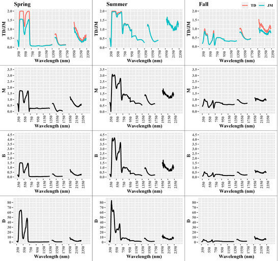Based on the set thresholds (Table 1), the highest number of wavelengths that offer good separation are found in the summer (i.e., 17.57% for TD, 14.45% for JM), whereas only 0.12% of wavelengths offer moderate separation with the TD metric during fall (Table S1, Supplementary Materials). This is an initial indication towards the preferable selection of the summer season for the detection of both shrubs. Overall, the TD metric suggests a higher number of wavelengths that offer good separability for the two shrubs compared to the JM metric (13.25% vs. 0.00% in the spring, and 17.57% vs. 14.45% in the summer), whereas the M metric cannot distinguish moderate or good separation.