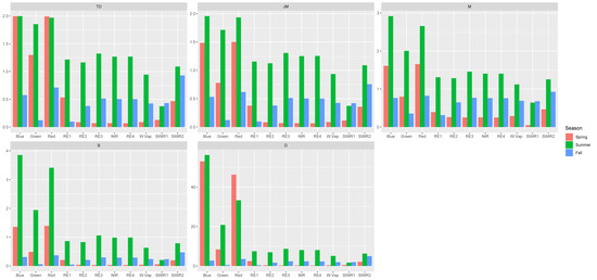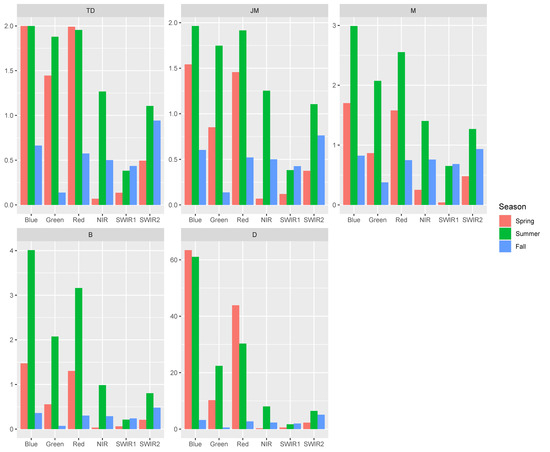 Shrub species broadband spectral separability: The spectral separability metrics calculated for the Landsat 8 broadband simulation are depicted in Figure 5 for each band and season, and in Figure 6 for Sentinel-2A. It is clear that the bands in the visible spectrum are more important during spring and summer, whereas the SWIR-2 band seems to have the highest separability during fall. However, these values are much lower during fall compared to the other two seasons, for which summer shows the highest values for most metrics and bands. These results go in line with the outcomes of Section 3.2 and Figure 4. Based on the thresholds from Table 1 and the ensemble approach, we can see that Landsat 8 offers moderate separability between the two shrubs with the blue and red band. However, for Sentinel-2, only TD shows good separability for those two bands, and not JM (Table 4). In the summer, the blue and red bands of both sensors offer good separation, and the green band moderate, whereas none of the bands offer any level of separation in the fall. These findings agree with the previous ones from Section 3.2 regarding the selection of the summer season for the detection of wolfwillow and western snowberry, and the fact that the TD metric suggests higher separability than JM during spring.