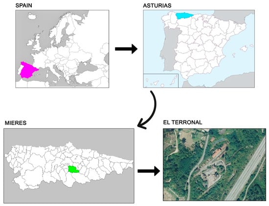 The study site is an abandoned Hg mine and metallurgy area called “El Terronal”, located in a geographical radius of 10 km around of Mieres (20 km of Oviedo), in Asturias, NW Spain (Figure 1). With abundant Hg ore deposits, Asturias, from the 1950’s until the 1970’s, was an important mercury producer on a world scale, with an average annual production of 15,000 flasks (1 flask = 34.5 kg) [28].