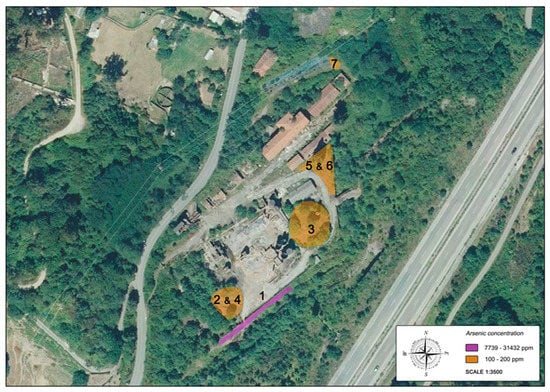 - González-Fernández, B.; Rodríguez-Valdés, E.; Boente, C.; Menéndez-Casares, E.; Fernández-Braña, A.; Gallego, J.R. Long-term ongoing impact of arsenic contamination on the environmental compartments of a former mining-metallurgy area. Sci. Total Environ. 2018, 610–611, 820–830. [Google Scholar] [CrossRef] [PubMed]