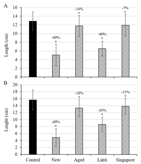 Pre-germinated wheat (T. aestivum L.) seedlings were cultivated for seven days in soil containing 2% MP particles (≤4 mm, w/w) derived from four different bottle caps batches, i.e., new, aged, collected from Lahti and Singapore. The root length of T. aestivum grown in soil containing MP derived from new bottle caps was inhibited by 60% (p < 0.001) (Figure 1A). With artificially aged MP present in the soil, root length was reduced by 14% compared to untreated controls (p < 0.001). The roots of seedlings cultivated in soil containing MP from bottle caps collected in Lahti showed an inhibitory effect of 49% (p < 0.001), whereas those collected in Singapore inhibited the root growth by 7% (p < 0.001), which is statistically the same inhibition as caused by the aged MP (p = 1).