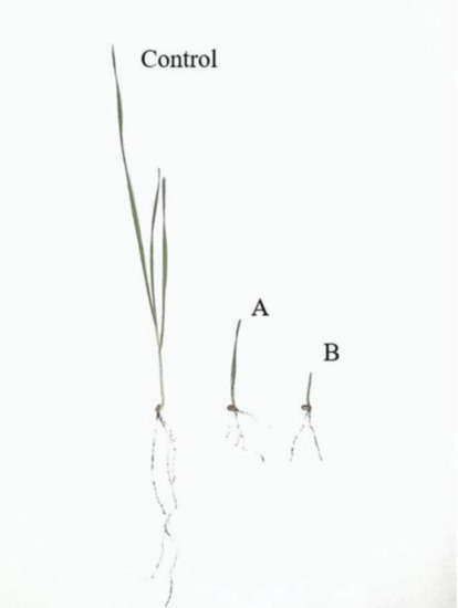 T. aestivum, as a monocotyledon, has a fibrous root system, which is characterized by numerous roots with similar diameters emerging from the stem’s base. A fully functioning root system is essential for plants to thrive and for agricultural crops like wheat to achieve the expected crop yield [29]. Root growth can be affected by internal as well as environmental parameters [30]. A disturbance in root development and growth at an early stage of plant life determines its further growth and development. The uptake of water and nitrogen in its nitrate form is positively correlated with long roots and vigorous root growth [31]. Therefore, in the shorter roots of MP exposed T. aestivum, water and nitrate uptake might be impaired, influencing the shoot growth. Root morphology was visibly changed (Figure 2), exhibiting overall shorter root systems, and in the case of exposure to Lahti derived MP, a drastically reduced root system was seen (Figure 2B).