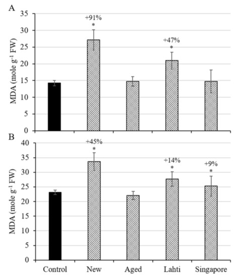Oxidative stress can be assessed by measuring lipid peroxidation, i.e., destruction of membranes by reactive oxygen species (ROS). This three-step process is initiated by the hydroxyl radicals reacting with polyunsaturated fatty acids yielding a peroxy radical. The radical initiates a chain reaction and forms unstable lipid hydroperoxide, which undergoes a Fenton reaction in the presence of Fe, resulting in a reactive alkoxy radical. Among the degradation products of lipid hydroperoxides is MDA. In the present study, wheat seedlings exposed to MP generated from new plastic bottle caps for seven days showed a significant increase of MDA in roots by 91% (p < 0.001) (Figure 3A). The MDA concentration in the roots of seedlings exposed to MP from the bottle caps collected from Lahti increased by 47% (p < 0.001). However, exposure to artificially aged MP and MP from Singapore did not affect the MDA concentration in the roots (p = 1).