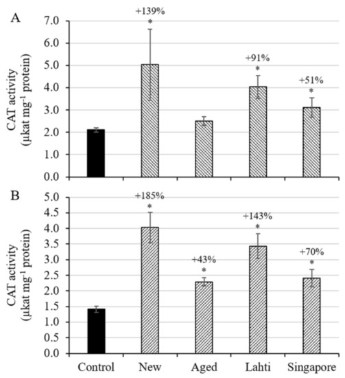 Oxidative stress is combated in plants by increasing the expression and activity of the antioxidative enzymes [34]. Catalase is one of the enzymes involved in detoxifying hydrogen peroxide in cells by conversion to water. The catalase activity in wheat roots (Figure 4A) grown for seven days in soil containing MP derived from the new cap was enhanced by 139% (p < 0.001) and with MP material from Lahti caps by 91% (p < 0.001). Using the Singapore material, the enzyme activity increased by 51% compared to the control (p < 0.001); however, no effect was observed with exposure to the artificially aged plastic caps (p = 0.234).