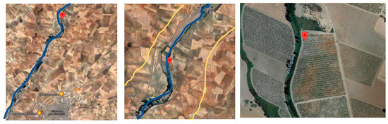 Location of the soil profile, derived from Google Earth. The blue line indicates the Cigüela river and the yellow line shows the area, with the presence of redox conditions. Soil profile situated at
