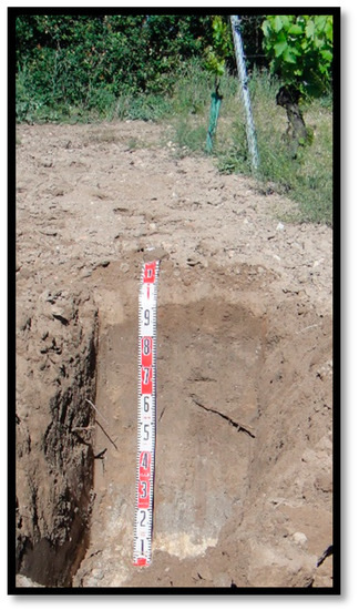 The land use/land cover map and soil map were used by Garcia-Navarro et al. [20] to plan soil sampling in the studied area. At this stage, the area was traversed and, with the help of a machine, 15 profiles were opened. The spatial data were made uniform and GPS-located, based on satellite images of high spatial resolution. The selected soil profile (Figure 2) was excavated to a depth of approximately 1.5 m to obtain a full description according to the FAO criteria [21]. The parent material of this soil was alluvium with limited distinct alluvial discontinuities. The soil was considered imperfectly drained and contained redoximorphic features in the lower horizons with a reduced matrix. The Munsell colors of the soil horizons ranged from 2.5Y 6/1 at the Cg1 (83–111 cm) to 2.5Y 7/3 at the Cg2 (>111 cm) horizon (Table 1). This effect was the result of endosaturation, which occurs when soil is saturated with water in one or more layers within approximately 100 cm of the mineral soil surface. Naturally, under saturated conditions, aerobic microorganisms consume all the available oxygen, while anaerobic ones metabolize and reduce Fe. The main vine variety was Tempranillo.