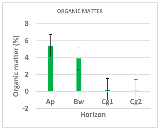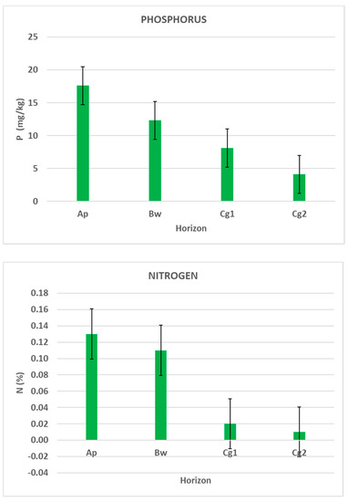 The soil characterization profile description and analytical characterization of the selected soil profile are summarized in Table 1 and Table 2 and Figure 3. Vineyard soils require good drainage to improve or sustain production, or to manage water supplies. Nevertheless, field observations confirmed the presence of poor drainage conditions. The slope (geomorphic) position had significant effects on properties, e.g., saturated soil moisture. The soil textural classes were silty loam in all soil horizons. The bulk density values varied between 0.90 g/cm3 and 1.46 g/cm3. An ideal bulk density for root growth, based on sandy loams and loam-textural soils, should be lower than 1.40 g/cm3 [29]. From the Ap to Cg2 horizons, the pH values of the soil samples varied within the limits of a moderately alkaline soil, and were approximately 7.6 to 8.2. The electrical conductivity of the soil horizons varied between 1.14 dS/m (Cg2 horizon) and 2.38 dS/m (Cg2 horizon). The soil samples had a lime content ranging from moderately (10.5%, Cg2 horizon) to very calcareous (24.6%, Cg1 horizon). Organic matter was highest in the surface layers and decreased regularly with depth. Organic matter content ranged from very low (0.1%, Cg1 horizon) to very high (5.4%, Ap horizon). With increasing depth, the organic matter decreased and carbonate content increased—except at the deepest horizon, where it also diminished. The cation exchange capacity varied between 10.4 (cmol+/kg) and 14.8 (cmol+/kg). The base saturation was nearly 100% across the entire profile. The dominance of exchangeable bases was in the order of Ca 2+ > K +> Mg 2+ > Na +. The exchangeable calcium in the soil samples achieved a value less than 14 (cmol+/kg), followed by potassium at 0.8 (cmol+/kg), magnesium at 0.4 (cmol+/kg) and sodium at 0.1 (cmol+/kg). The soil was low in available P and total N contents [4,16]; the available phosphorus contents were between 8.1 mg/kg and 17.6 mg/kg, and were classified as deficient.