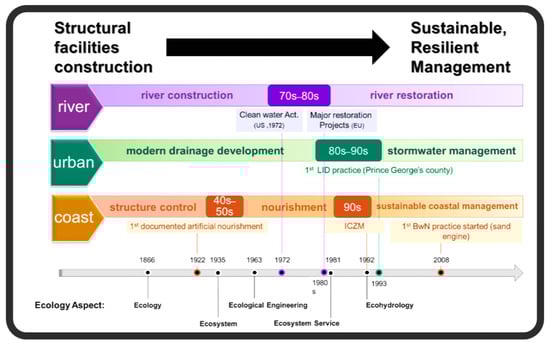 In recent decades, many innovative flood defense strategies have emerged globally to solve the different flood problems. These strategies, such as ‘building with nature’ (BwN), ‘low impact development’ (LID), ‘sustainable drainage systems’ (SUDS), ‘green infrastructure’ (GI), water-sensitive urban design (WSUD), sponge city, etc., have emphasized sustainability, resilience, and climate change adaption. Even though abundant literature exists for these solutions, only limited studies discuss the evolution of these approaches. Ecological engineering (EE), a coin termed by Odum in 1989, was the earliest step in initiating ecosystem-based approaches to flood management, which focused on waste clean-up and management (as cited in [10]). By the late 1990s, the term EE evolved to describe the design of sustainable ecosystems [11].