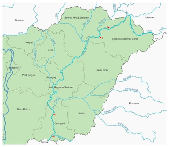 Hydrographic map of Tisza River and its tributaries arriving from Slovakia (Bodrog, Sajó) and Romania (Körös, Maros). The four sampling sites located at settlement Tímár (1), Tokaj (2), Csongrád (3), and Szeged (4) are marked with red circles.