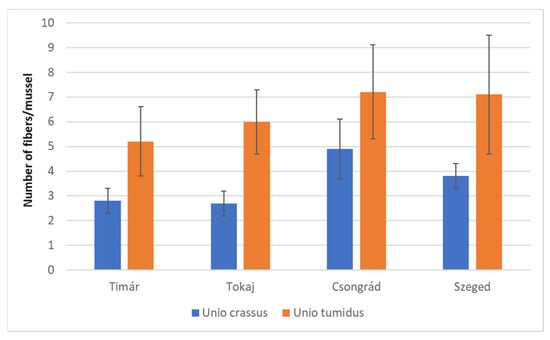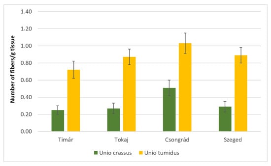 Number of fibers in mussels (n = 10) of Unio tumidus and Unio crassus collected at settlements of Tímár, Tokaj, Csongrád, and Szeged. The standard deviations are marked on the bars.