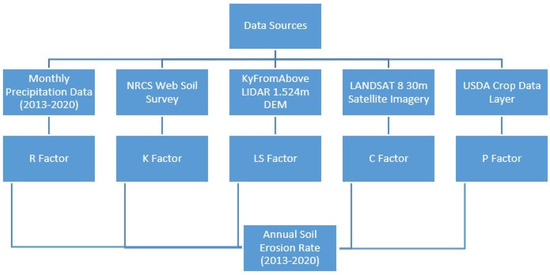 Finally, the data for our Support Conservation Practice Factor (P) was from the Crop Data Layer from the ‘USDA’s National Agricultural Statistics Service [35] between 2013 and 2020. Table 2 provides additional information on the various data sources for the model parameters.