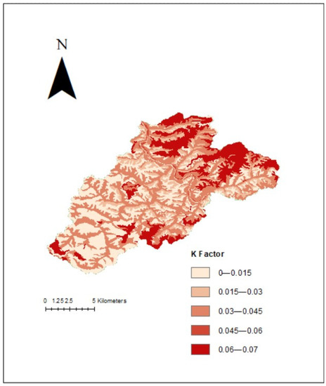 The soil erodibility factor (K) denotes the vulnerability of soil to erosion and its potential runoff rate [17]. It is based on several physical soil characteristics: sand content (in percentage), silt content (in percentage), clay content (in percentage), and soil organic matter (in percentage) [18]. Soils that are more resistant to erosion have low K factor values, while soils that are less resistant to erosion have higher K factor values. Soils with more clay content tend to be more resistant to soil erosion and have low K factor values, as they tend to be more resistant to detachment. Soils with more silt content tend to be more erosive and produce more runoff due to being more susceptible to detachment, and thus produce high K factor values.
