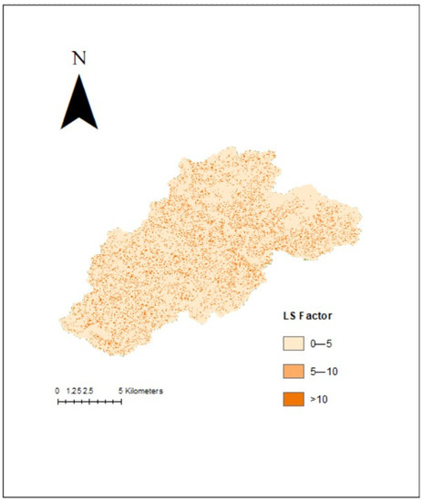 where, A is the upslope factor (calculated from the flow accumulation tool), is the slope angle (calculated from the DEM) in radians, and m is a model parameter that equals 0.2 when the slope is less than 1%, 0.3 when the slope is between 1 and 3%, 0.4 when the slope is between 3 and 5%, and 0.5 when the slope is above 5%. For the purpose of GIS implementation, the modified equation for L.S. replaces slope length measurement with the measurement of the upslope contributing Area, A, which includes the effect of flow convergence from rill erosion [21].