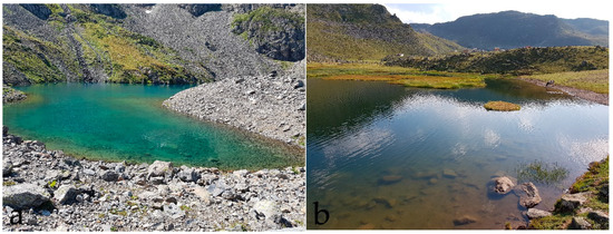 High mountain lakes have extreme environmental conditions such as low temperatures, low nutrients, short growing times, and high radiation, and they spend a large part of the year under ice and snow [,,]. Therefore, they usually have an oligotrophic character []. Organisms that adapt to these extreme climatic and physico-chemical conditions create a biodiversity unique to high mountain lakes []. Examination of high mountain lakes, which are regarded as indicators of environmental degradation and global changes, is of great importance for the future [,,,].