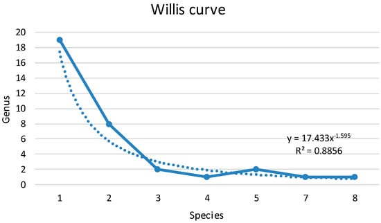 The first experience of constructing distribution curves for the number of genera species by the number of algae genera was carried out earlier by J.C. Willis in the book “Age and Area” in 1922 [] for different lists of faunas and floras of angiosperms, shows that the Willis curves constructed for the algal floras of various water bodies of Eurasia have a hyperbolic distribution only with a well-studied flora, and therefore the curve can be used as a criterion for the completeness of the list of algae [].