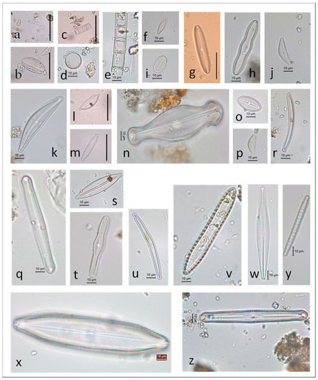 (a) Achnanthidium minutissimum, (b) Amphora ovalis, (c) Aulacoseira italica, (d) A. lacustris, (e) A. valida, (f) Brachysira brebissonii, (g) Caloneis alpestris, (h) C. silicula, (i) Cocconeis placentula var. euglypta, (j) Cymbella affinis, (k) C. cistula, (l) Cymbopleura amphicephala, (m) Diatoma vulgaris, (n) Didymosphenia geminata, (o) Diploneis elliptica, (p) Encyonema minutum, (q) Epithemia gibba, (r) Eunotia mucophila, (s) Frustulia crassinervia, (t) Gomphonema montanum, (u) Hannaea arcus, (v) Iconella linearis, (w) Navicula radiosa, (x) Neidium dubium, (y) Odontidium hyemale, and (z) Pinnularia major. Scale bar: 10 μm.