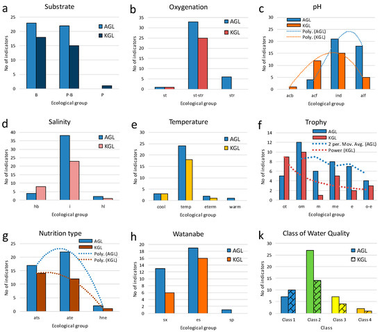 Distribution of indicator species number over the ecological groups in the Avusor Great Lake (AGL) and Koçdüzü Great Lake (KGL). Abbreviations: Substrate (a) B, benthic; P-B, planktonic–benthic; P, planktonic. Oxygenation (b) str, streaming well oxygenated waters inhabitant; st-str, low streaming medium oxygenated waters inhabitant; st, standing low oxygenated water inhabitant. Water pH (c) acf, acidophilic species; ind, indifferent; alf, alkaliphilic species; acb, acidobiontes. Water salinity (d) hb, halophobe; i, oligohalobious-indifferent; hl, oligohalobious-halophilous). Water temperature (e) cool, cool-loving species; temp, temperate temperature water inhabitants; eterm, eurythermic species, warm, warm water inhabitants. Trophic state (f) ot, oligotrafentic; o-m, oligo-mesotraphentic; m, mesotraphentic; me, meso-eutraphentic; e, eutraphentic; o-e, oligo- to eutraphentic. Nutrition type as Nitrogen uptake metabolism (g) ats, nitrogen-autotrophic taxa, tolerating very small concentrations of organically bound nitrogen; ate, nitrogen-autotrophic taxa, tolerating elevated concentrations of organically bound nitrogen; hne, facultative nitrogen-heterotrophic taxa, needing periodically elevated concentrations of organically bound nitrogen. Organic pollution, Watanabe diatom indicators (h) sx, saproxenes, es, eurysaprobes; sp, saprophiles. Class of water quality based on species–specific saprobity index S (k) Class 1, S = 0.0–0.5; Class 2, S = 0.5–1.5; Class 3, S = 1.5–2.5; Class 4, S = 2.5–3.5.