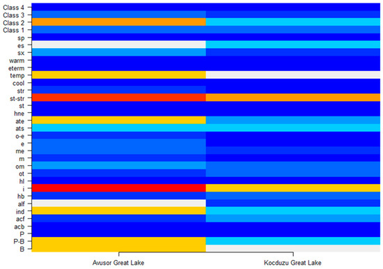 Figure 7 is a generalized view of the bioindicative characteristics of both lakes. The heat map was based on the distribution of the abundance of indicator species by ecological groups. The abundance of indicator species in Avusor Great Lake is generally higher. The predominance of indifferent indicators in terms of salinity and moderately oxygenated waters is well expressed (red). At the same time, the abundance of a group of plankton–benthic and benthic species, as well as indifferences in water pH and the second quality class (yellow) is confirmed by an analysis of the distribution of the number of indicator species.