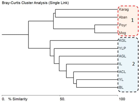 Bray-Curtis similarity analysis of species content in the Artabel Lakes in Gümüşhane province (Artabel Lakes (ARL), Beş Lakes (BL), Yıldız Lakes (YL), Acembol Lakes (ACL), İsimsiz Lake (IL), and Yıldız Lake (YLP)) according [], the Avusor Great Lake (AGL), Koçdüzü Great Lake (KGL), and other lakes in northern Turkey (Mogan (Mog), Abant (Aban), Poyrazlar (Poyr), Karagol (Karag)) according [].