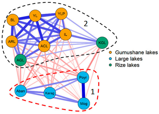 JASP Network plot of correlation on the level more than 50% for species composition of the lakes in Rize province, of the Artabel Lakes in Gümüşhane province, and other lakes in northern Turkey. Abbreviations: Artabel Lakes (ARL), Beş Lakes (BL), Yıldız Lakes (YL), Acembol Lakes (ACL), İsimsiz Lake (IL), and Yıldız Lake (YLP) according []; the Avusor Great Lake (AGL), Koçdüzü Great Lake (KGL); other lakes in northern Turkey: Mogan (Mog), Abant (Aban), Poyrazlar (Poyr), Karagol (Karag) according []. The line thickness between lakes reflects the correlation value (represented significant only); blue is positive, red is negative. Clusters are outlined by dashed lines.