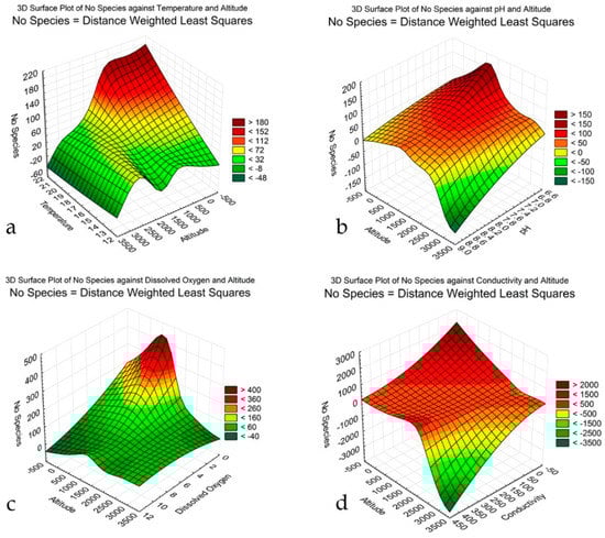 In this case, the surface plots were constructed to follow the analysis. Figure 10 show that diatom species richness can be greater if the altitude decreased but the water temperature increased (Figure 10a) and if water pH decreased (Figure 10b). Species number also increased in lower altitude and dissolved oxygen (Figure 10c) and lower conductivity (Figure 10d).