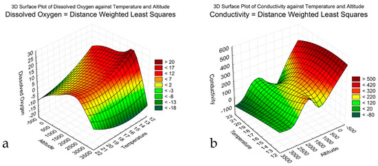 Distribution of major environmental variables over altitude of the lakes in Rize province, the Artabel Lakes in Gümüşhane province, and other lakes in northern Turkey based on Table 3. Distance Weighted Least Squares dependence of environmental parameters: (a), dissolved oxygen and water temperature and altitude; (b), water conductivity and temperature and altitude.