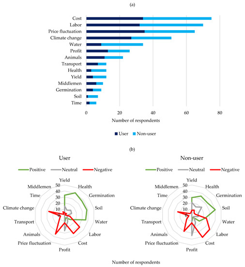 Looking at Figure 1a, it becomes clear that the most frequently perceived problems for smallholder farmers are high input costs and unstable sale prices. This is followed by topics related to climate change and water resources, which also receive a lot of attention. Significant differences can be seen for water resource problems, with p = 0.002 (Figure 1b—including all ratings), with 15% of users and 42% of non-users perceiving water resources in agriculture as being unproblematic. For the other problems from Figure 1, no significant differences between users and non-users could be determined. This also includes the problematic aspects that are directly related to the cultivation of the crops (health, yield, and germination rate).
