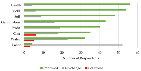 The problematic points are almost all felt to be improved using co-compost (seen in Figure 2), whereby the costs and the availability of labor remain unaffected by the changed resource management. In particular, plant and soil health, and crop yield improved. At the same time, the costs for the substrate used and water consumption fell. These aspects together explain the improved profit. All responses show significant improvements when directly compared to non-user responses for the same issues. Significance is shown for plant health (p = 0.027), yield (p = 0.014), soil (p = 0.001), germination (p = 0.012), and water (p = 0.017). Few respondents attributed the fact that the water requirement worsened and thus increased to the heat radiation of the co-compost. Although there are significantly fewer water issues for users of co-compost than for non-users (Figure 1), this is not the main criterion that is seen as a benefit of co-compost. The focus is on returns and profits (Figure 2).